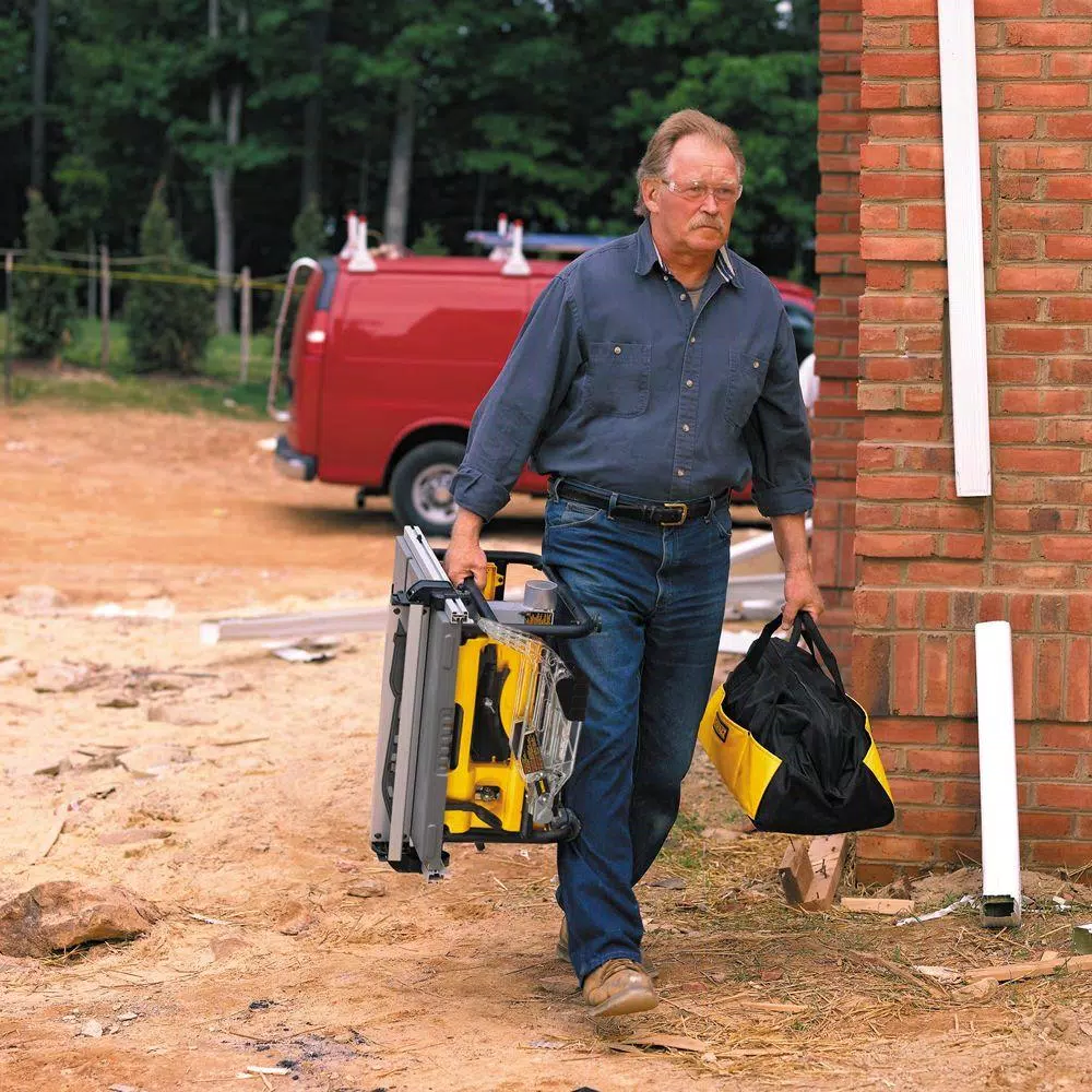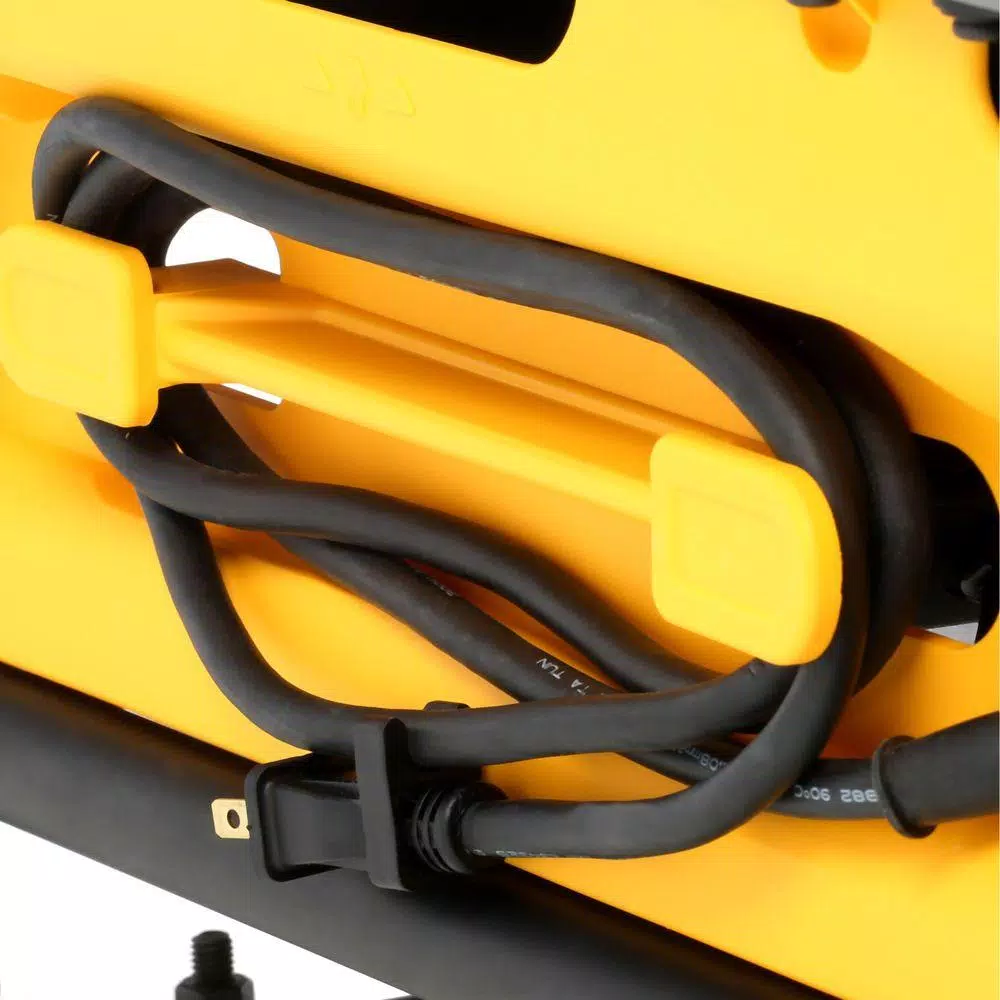 Tackle tough jobs with this DEWALT 10-in. compact job site table saw. Durably built with a 15-amp motor that produces up to 3850 RPM, you can easily rip through hardwood, pressure-treated lumber and other tough materials with this lightweight tool. It is easy to transport and features an all-metal roll cage for added protection during heavy-duty use.