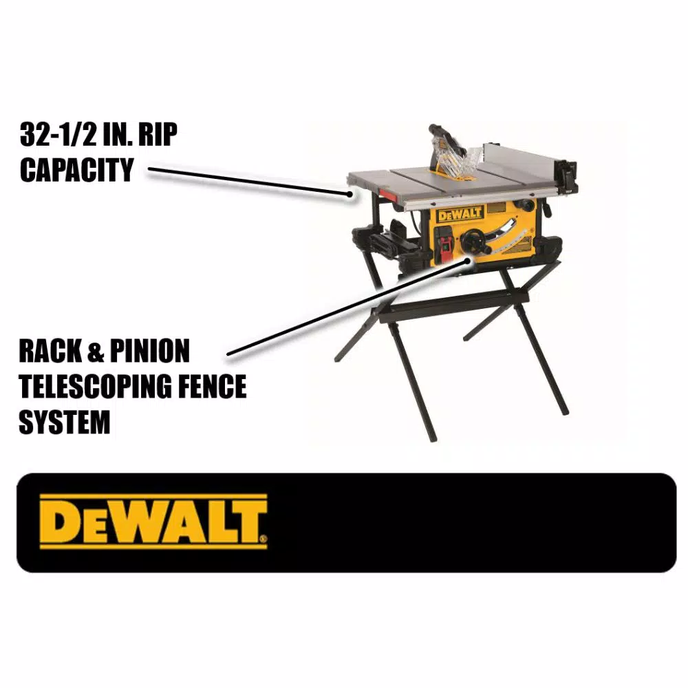 The DWE7491X 10 in. Jobsite Table Saw with Scissor Stand has a 15 Amp motor and 32-1/2 in. rip capacity to allow cutting of large and hardwood materials. Features tool-free guarding component adjustments and fast, accurate fence adjustments. Scissor stand designed for easy set up and breakdown with excellent stability.