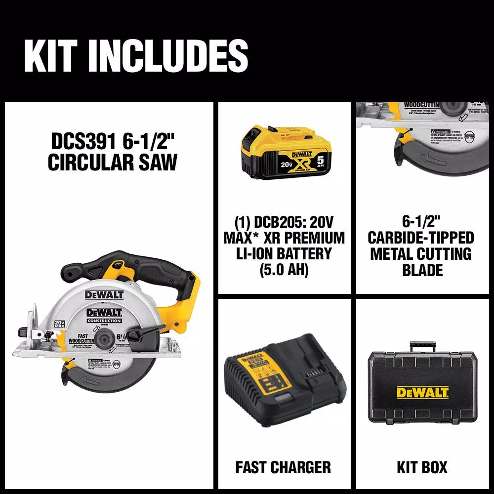 The DEWALT DCS391P1 cordless circular saw kit features a powerful 5150 RPM motor that delivers power and speed to make the most demanding cuts with ease. This saw is designed with a high strength and lightweight magnesium shoe that provides jobsite durability for long-term cut accuracy. The DCS391P1 is backed by a DEWALT 3 year limited warranty for added peace of mind.