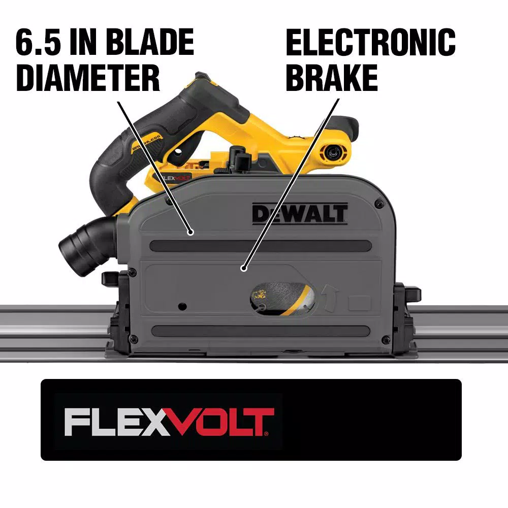 The DCS520T1 60-Volt MAX 6-1/2 in. TrackSaw Kit has a brushless motor to easily power through hardwoods up to 2-1/8 in. thick. Features straight plunge mechanism for optimal ergonomics. For use with TrackSaw cutting system to deliver precise, straight, splinter-free cuts.