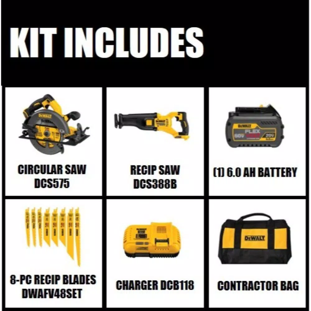 The DEWALT DCS575T1 7-1/4 in. (184 mm) Circular Saw with Brake is maximized for runtime and durability. It delivers the power and cut capacity of a corded circular saw with the portability and convenience of cordless through DEWALT’s revolutionary FLEXVOLT technology. The DCS575T1 comes with 60-Volt Max Lithium-Ion battery and fast charger. for a limited time get a bonus with purchase.