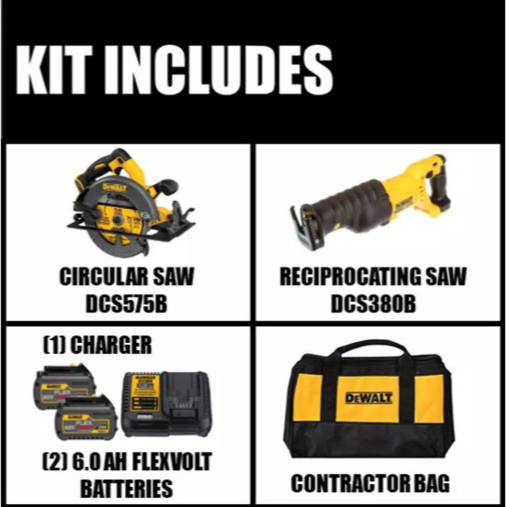 The DCS575T2 7-1/4 in. (184 mm) Circular Saw with Brake is maximized for runtime and durability. It delivers the power and cut capacity of a corded circular saw with the portability and convenience of cordless through DEWALT’s revolutionary FLEXVOLT technology. The DCS575T1 comes with two 60-Volt MAX Lithium-Ion batteries and fast charger. This combo comes with a bonus DEWALT DCS380B 20-Volt MAX Lithium-Ion Reciprocating Saw that has a 4-position blade clamp that allows for flush cutting and increased positional versatility with tool-free blade changes. The 1-1/8 in. stroke length allows the blade to cut more material in 1 pass than blades with shorter lengths, allowing you to work more efficiently. It has a variable-speed trigger with 0-3000 SPM to provide increased blade control and faster cut speeds. The pivoting adjustable shoe extends blade life and allows for easier depth-of-cut control. It has a rubber over-molded comfort grip that delivers optimal balance and control even when used for long periods. The double oil-sealed shaft resists contamination and increases durability.