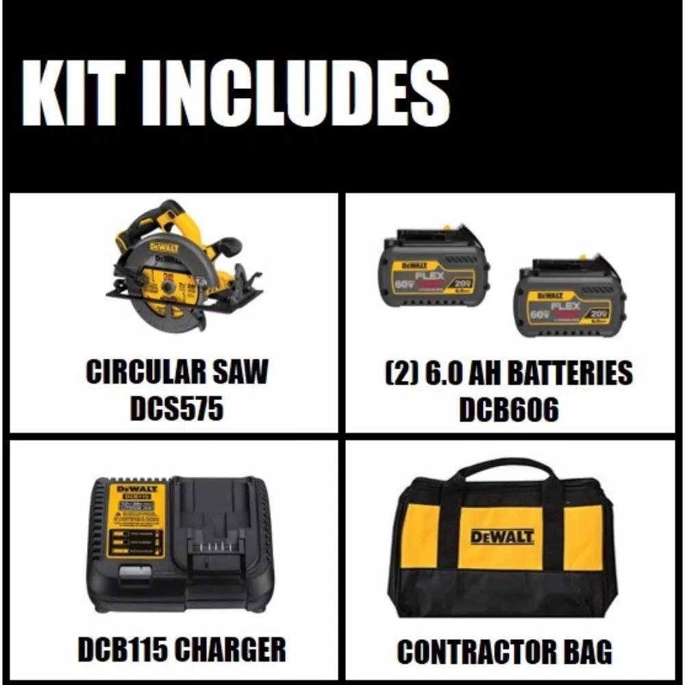 The DCS575T2 7-1/4 in. (184 mm) Circular Saw with Brake is maximized for runtime and durability. It delivers the power and cut capacity of a corded circular saw with the portability and convenience of cordless through DEWALT’s revolutionary FLEXVOLT technology. The DCS575T1 comes with two 60-Volt MAX Lithium-Ion batteries and fast charger.