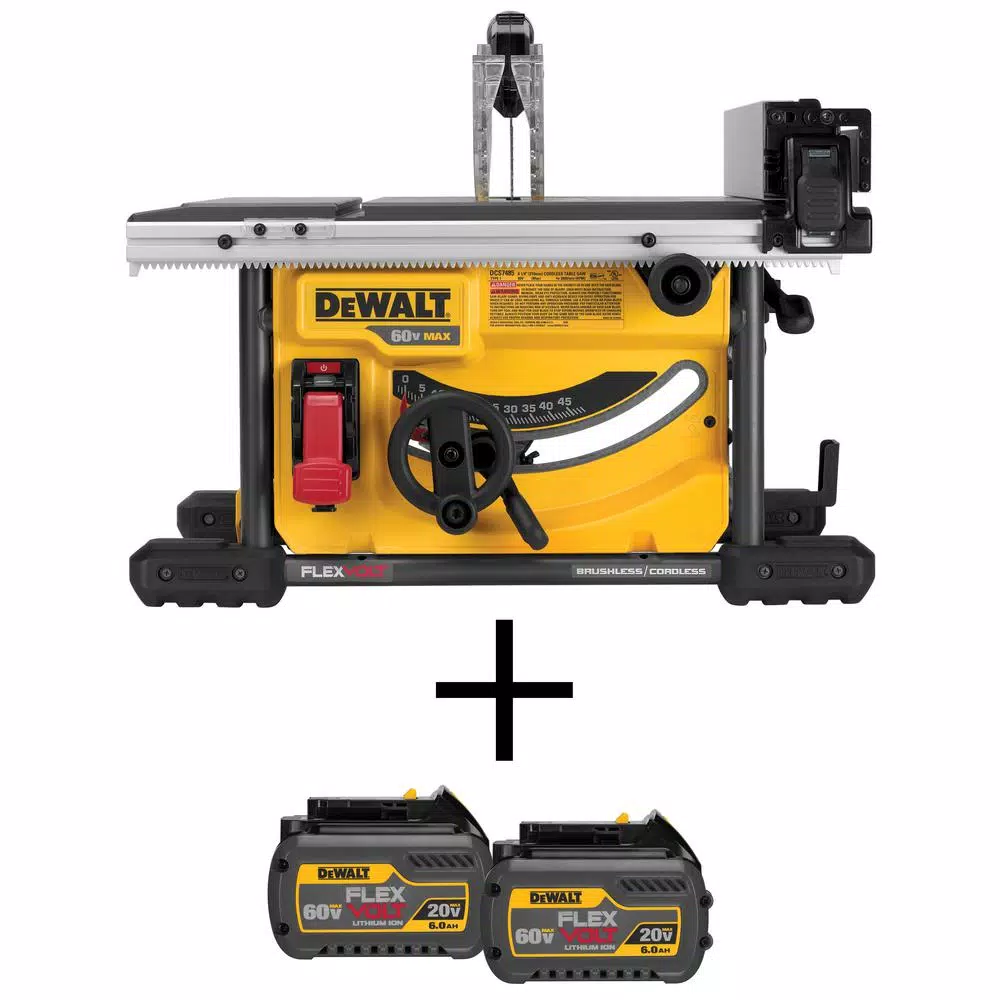 The 60-Volt Max 8-1/4 in. table saw by DeWalt is maximized for accuracy, capacity and runtime. The brushless motor delivers the power to cut all common materials. A rack and pinion fence allows for fast, easy adjustments and provides the capacity to rip 4ร8 sheet goods. Battery and charger are sold separately.
