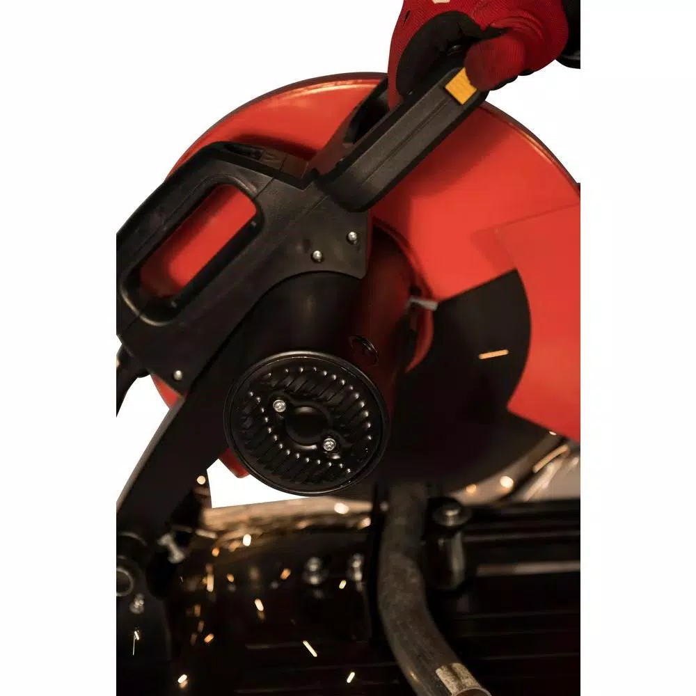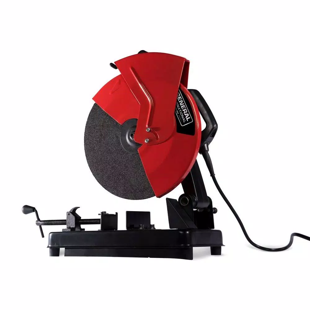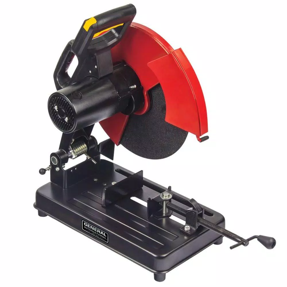The General International 15-Amp 14 in. Chop Saw cuts materials up to 4-1/2 in. thick and with the correct blade, can be used to cut conduit, ABS, copper pipe, tile and concrete. With a safety interlock trigger, vise clamp assembly with quick release, comfortable horizontal βDβ handle with hold-down lock button, plus carry handle, this is the go to chop saw for portability, power and safety. The D-handle design reduces the amount of pull needed to move the handle when cutting, thereby reducing user fatigue on the jobsite. The stable steel base adds a level of security and safety while the saw is in operation. This chop saw has a 15-Amp, 3,800 RPM motor thatβs ready to assist on any cutting job. It has replaceable brushes that bring needed muscle and a rugged durability. The sawβs sturdy cutting fence with a miter adjustment makes it possible for 45Β° angles to be cut without any problems. The sawβs spindle lock lets the blades be changed easily, which helps to save time while working on a job. The guard and adjustable spark deflector also add extra safety. Backed by a 2 year limited warranty.