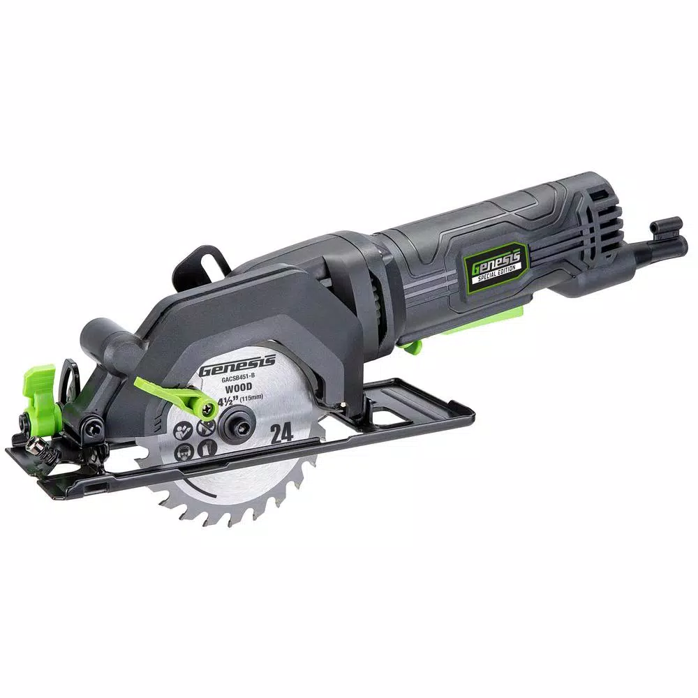 Introducing the NEW Genesis SE GCS445SE 4.0 Amp Compact Circular saw. This new saw can cut through 2X material and can bevel 45Β° for cutting through wood with the included 24T carbide tipped blade. Includes a dust collector hose, rip guide, and Allen wrench. Add the NEW Genesis GCS445CSE Compact Circular Saw to your garage, workshop, or tool set today.