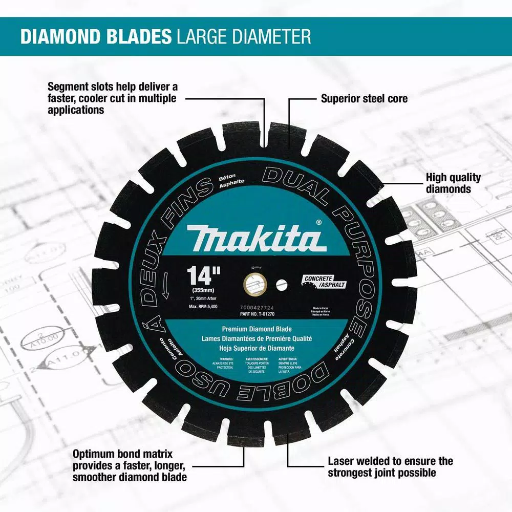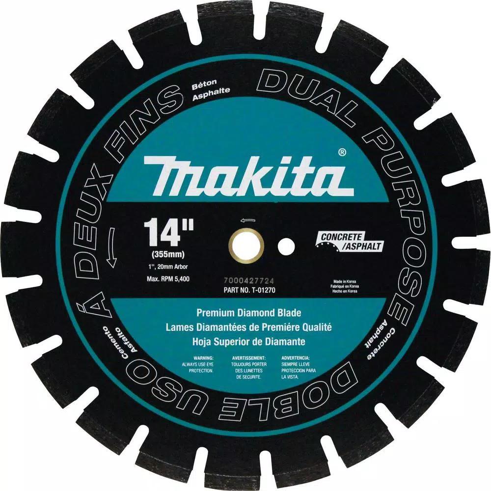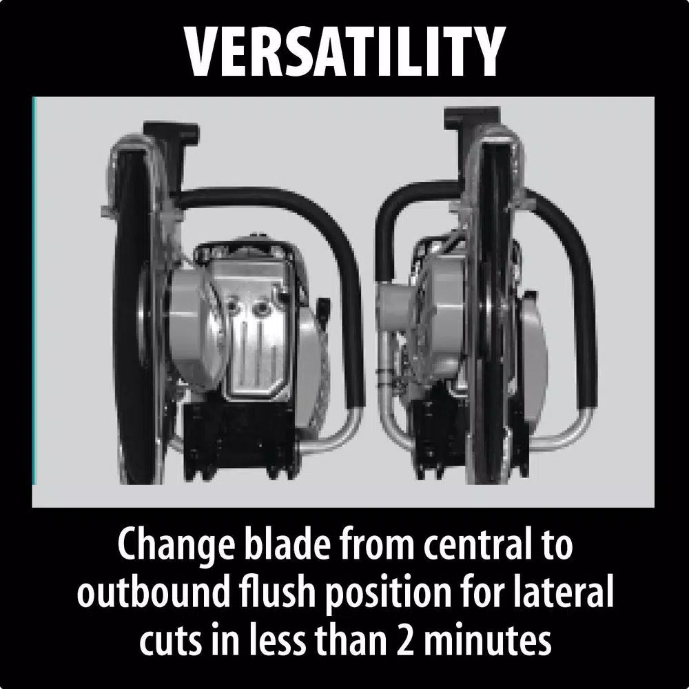 The Makita 14 in. Power Cutter (model EK7301) is a gas power cutter engineered to meet the demand for convenience and performance. The EK7301 delivers with faster starting, more power, and improved fuel economy. The EK7301 has a 4.5 cu./in. (73 cc) engine with 5.1 HP (maximum horsepower) and a no load speed of 9,350 RPM to take on the most demanding applications. The ignition coil with start-support function stores electrical power with each pull for easier start-ups. Its engineered for reduced flooding with a carburetor that includes improved deco-valve and metering spring for precise fuel regulation at start up. The EK7301 also features more efficient fuel consumption with an SLR muffler that recycles unburned fuel vapor for reduced scavenging-losses and 15% improved consumption. The EK7301 also features a 5-stage foam-paper-nylon air filter system with advance directional air flow that provides cleaner air for better saw performance and easy filter cleaning and replacement. The EK7301 is engineered for professional concrete cutting applications and is ideal for landscapers, road construction crews, railroad crews, rescue crews, general steel contractors, This Promotion also comes with a bonus Makita T-01270 14 in. Diamond Blade, Segmented, Dual Purpose.