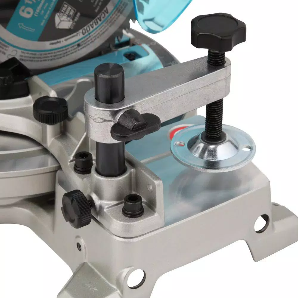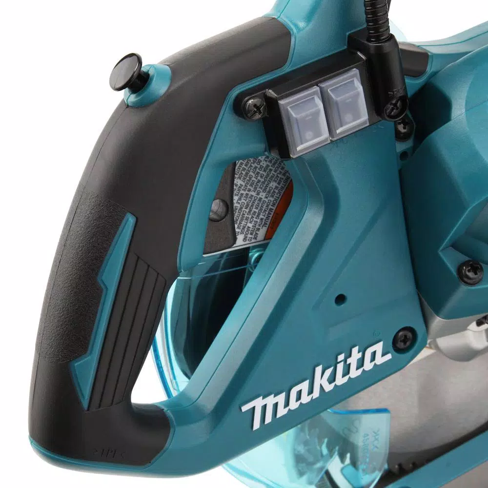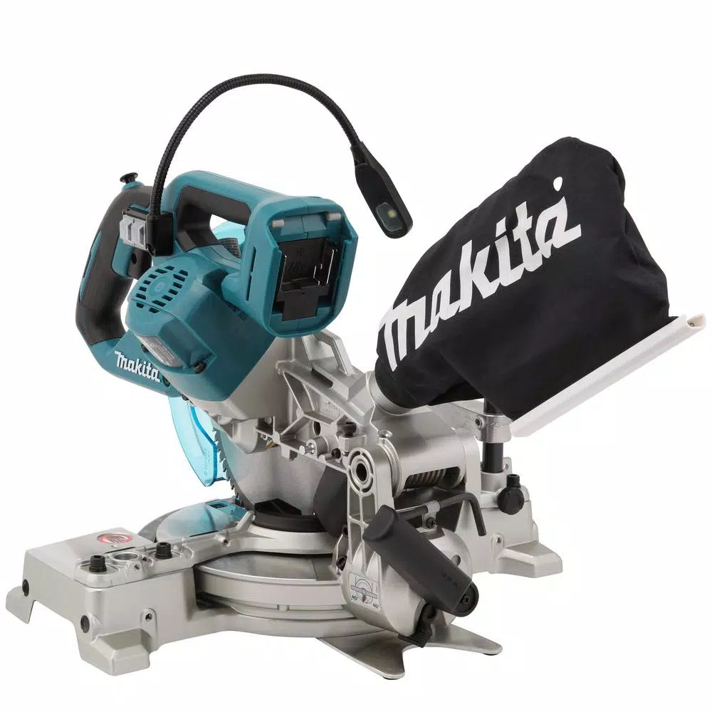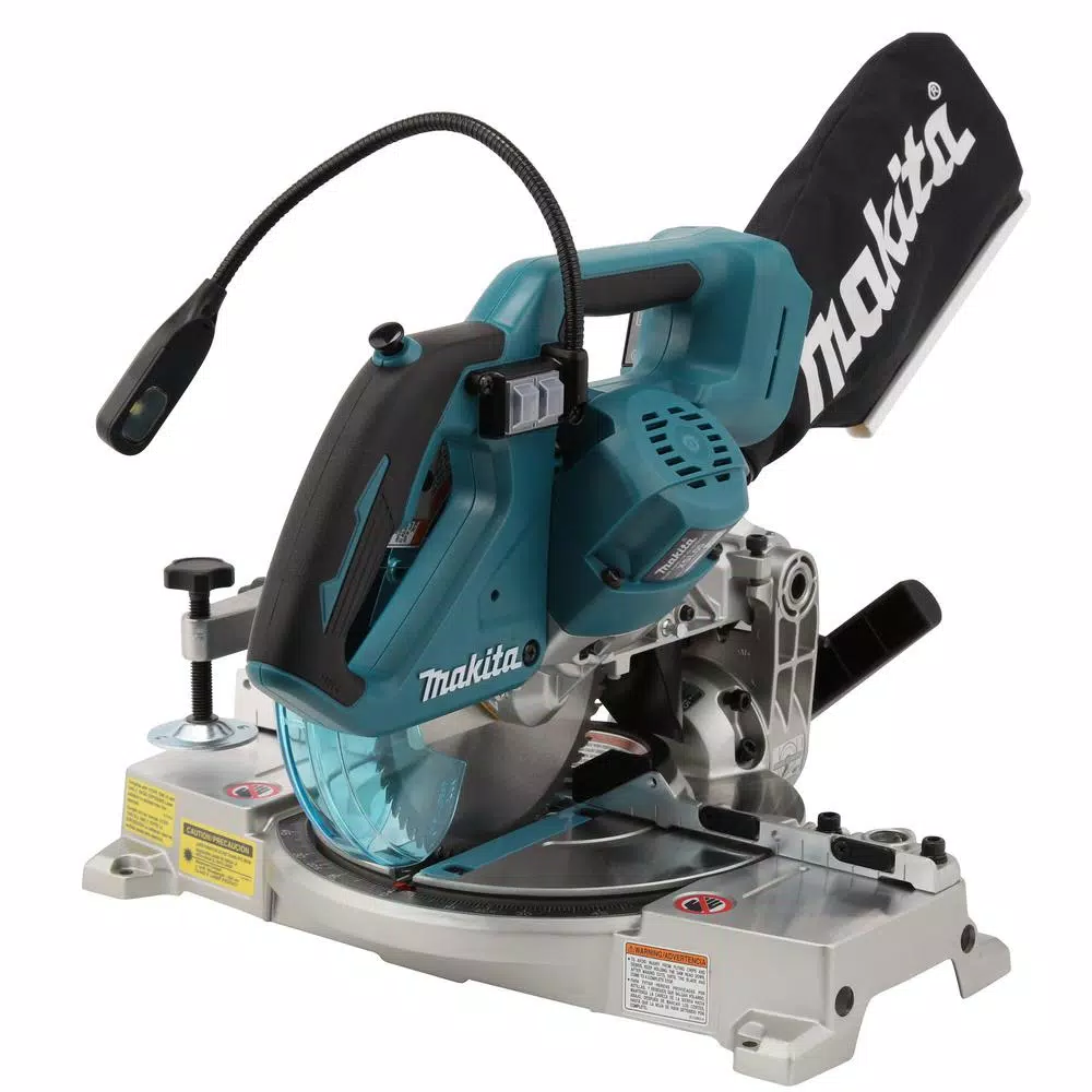 Makita offers a portable cutting solution with the 18-Volt LXT Lithium-Ion Brushless 6-1/2 in. Compact Dual-Bevel Compound Miter Saw with Laser (tool only). The efficient BL Brushless Motor is engineered for up to 50% longer run time, increased power and speed, and longer tool life with no brushes to replace. The XSL05Z combines performance and portability: it weighs only 14.6 lbs. with battery (sold separately), and is equipped with Automatic Speed Change technology which adjusts cutting speed and torque for optimum performance under load. This compact cordless miter saw is engineered for cutting a variety of materials including wood and aluminum extrusion (aluminum blade and cutting lubricant sold separately). It is ideal for room-to-room applications including baseboard and ceiling trim. It has a cutting capacity 1-13/16 in. x 3-5/8 in. at 90 and 1-13/16 in. x 2-9/16 in. at 45. It miters 0-52 left and right; bevels 0-46 left and right, with miter detents at: 0, 15, 22.5, 30 and 45 left and right. Added features include a built-in LED light, and a see-through blade guard system for greater visibility of blade and line of cut. It has a direct-drive gear system so thereโs no belt to slip or replace.