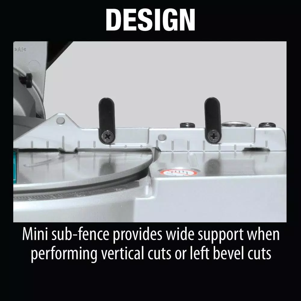 - Mini sub-fence provides wide support when performing vertical cuts or left bevel cuts