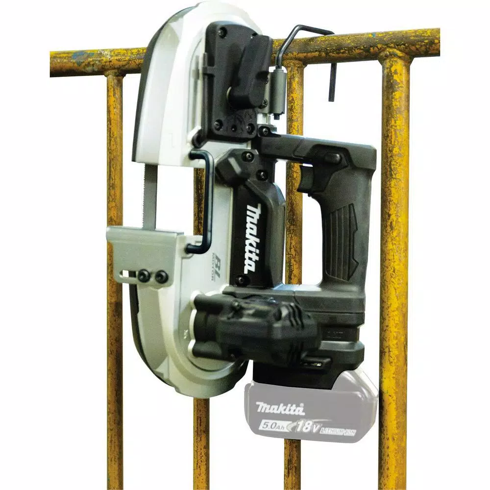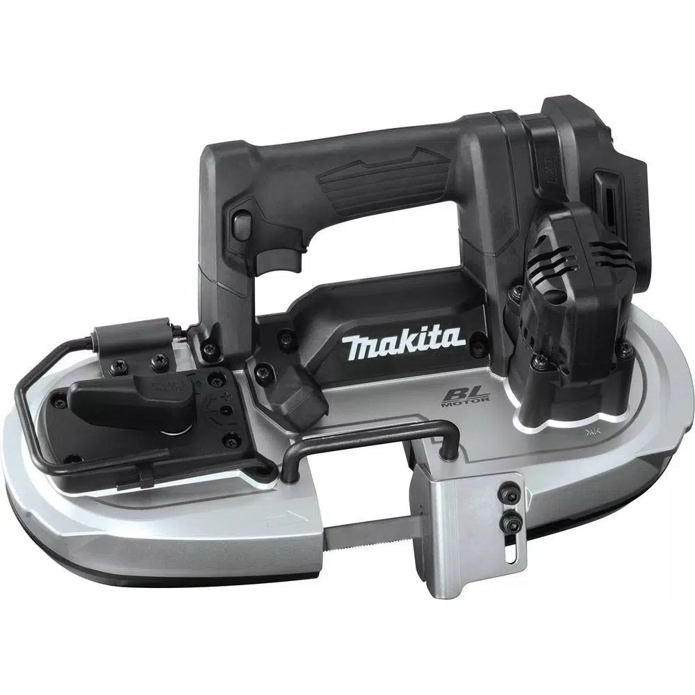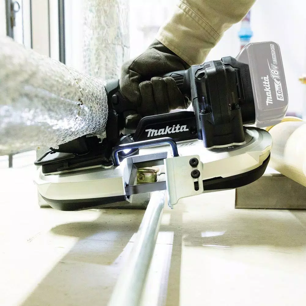 The Makita 18V LXT Sub-Compact Brushless Cordless Portable Band Saw (XBP05ZB, tool only) delivers cordless metal cutting power in a compact size. The XBP05ZB is a sub-compact cutting solution designed for one-handed operation in tight spaces and overhead cutting applications. The XBP05ZB features a BL Brushless Motor that delivers 0-630 ft./min. variable blade speed for faster, more efficient cutting. It performs up to 160 cuts of ยพ in. EMT with one charged 18V LXT 2.0Ah Battery. Constant speed control automatically applied additional power to the motor to maintain speed under load during challenging jobs. Overload protection is designed to protect the motor from burnout during abnormally high torque situations. The XBP05ZB weighs just 7.3 lbs. (with battery, sold separately) with a more compact design at 14-3/4 in. L and an ergonomic shape that fits like a glove for reduced operator fatigue. It has a 2 in. x 2 in. cutting capacity. The XBP05ZB is also equipped with a built-in L.E.D. light that illuminates the work area for more efficient work, as well as rubber bumpers and a removable hook. It meets ANSI blade guarding requirements for one-handed operation. Trigger switch with lock-off feature requires two actions to power-on the band saw. A catch bar helps eliminate accidental follow through during repetitive cutting.