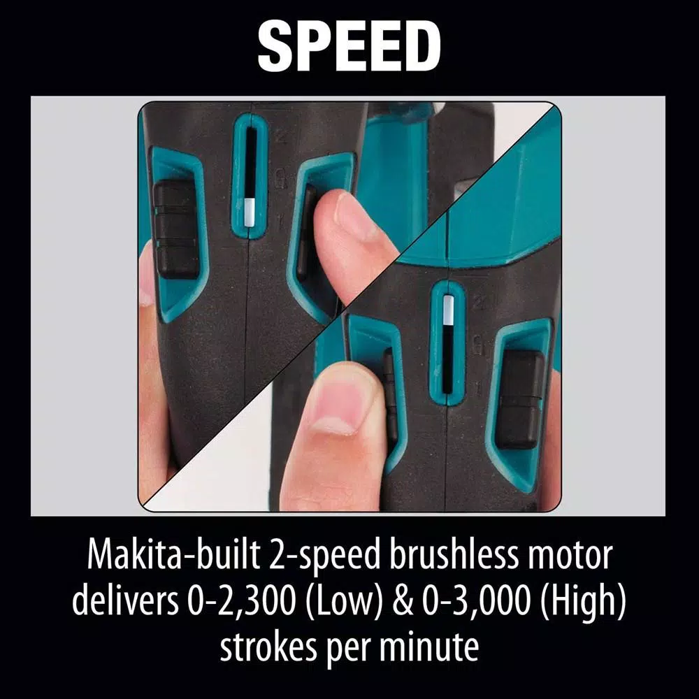 - Powerful BL brushless motor delivers 0-3,000 (metal cutting) and 0-2,300 (wood cutting) strokes per minute for faster cutting