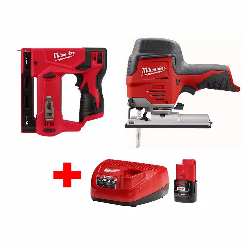 The Milwaukee M12 Cordless 2 Tool Combo Kit includes M12 Jig Saw (2445-20) and M12 3/8 in. Crown Stapler (2447-20). Milwaukee M12 12-Volt Lithium-Ion Cordless Compact Jig Saw (Tool-Only) delivers superior cutting power suitable for a wide range of trade applications. Powered by the M12 REDLITHIUM battery system, the tool is ideal for making quick cuts in wood, metal, wall tile or plastics without the hassle of a cord. The hybrid grip handle design combines the best features from both top handle and barrel grip jig saws to provide superior cut control during curved cutting applications. A 3/4 in. stroke length and 0-2800 SPM variable speed trigger deliver fast and accurate cuts and with the QUIK-LOK T-Shank blade clamp and tool-free 450 bevel capability, tool adjustments are quick and easy. Suitable for professional use or for DIY projects, this jig saw is durably made for long-lasting and reliable use. M12 3/8 in. 12-Volt Cordless Crown Stapler delivers a true hand tool replacement. The 2447-20 is designed to drive a range of 3/8 in. flat crown staples (1/4 in.- 9/16 in. ) through an array of materials and substrates. At just 3.0 lbs. and 7.5 in. long the compact design allows for great access into tight spaces and convenient tool belt portability.