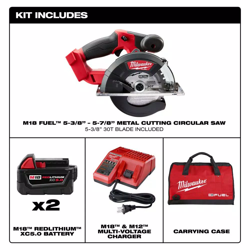 - Includes: 2782-20 M18 FUEL metal saw, two M18 REDLITHIUM XC5.0 batteries, M18/M12 combi charger, 5-3/8 in. 30T blade, Allen wrench, contractor bag
