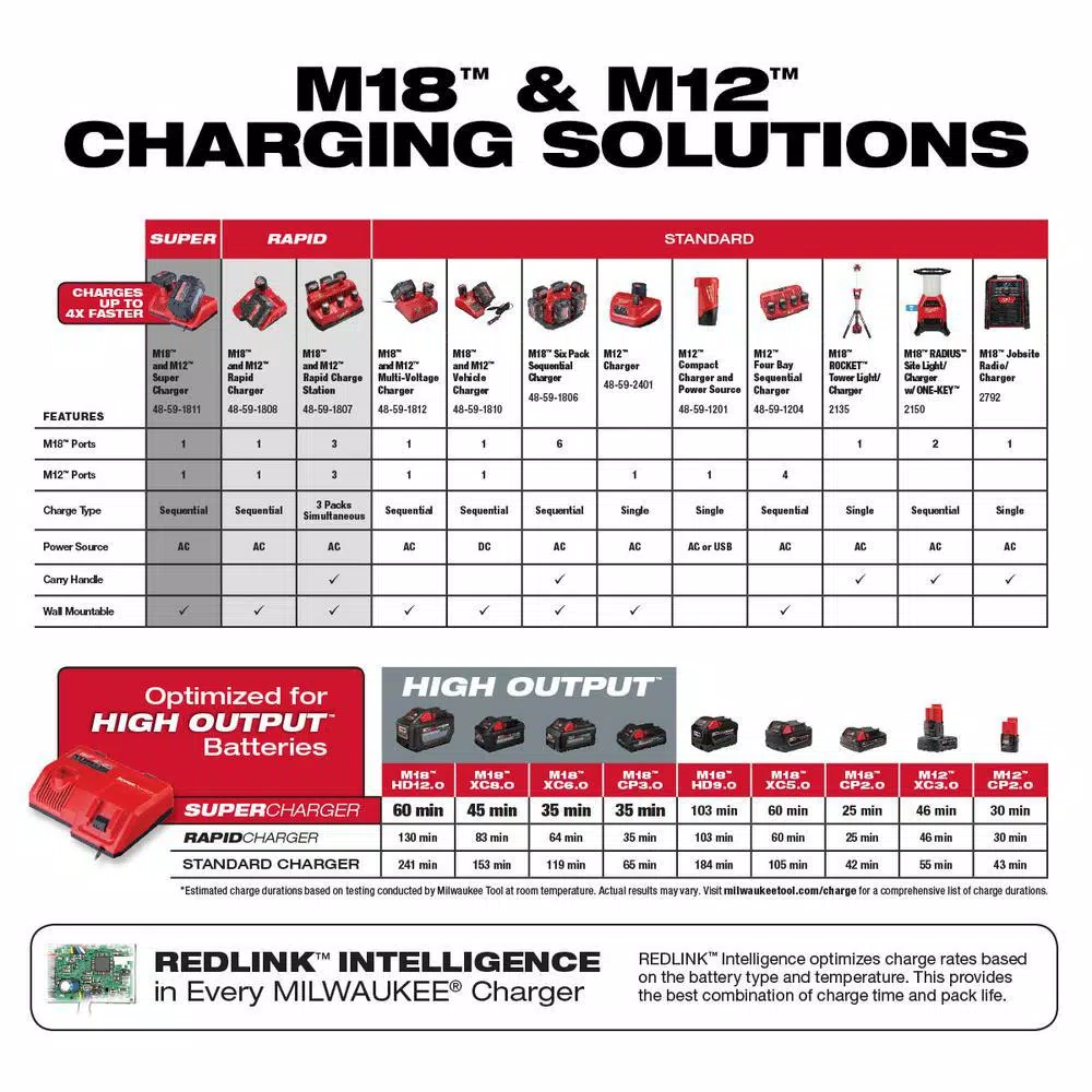 - M18 and M12 supercharger charges batteries up to 4x faster
