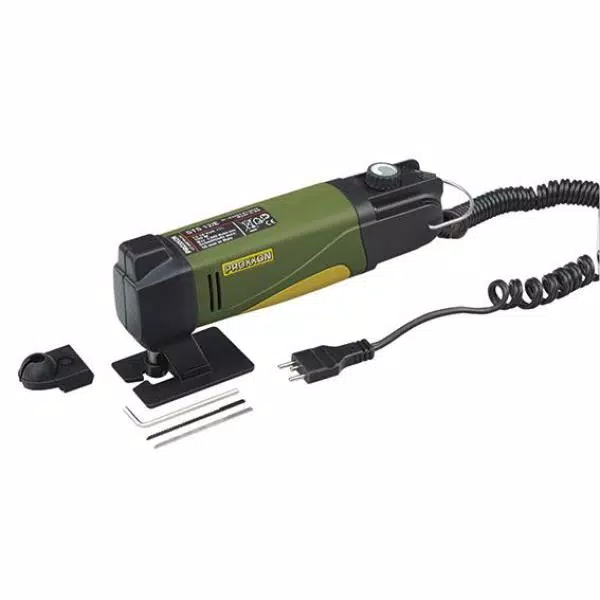The Proxxon Jig Saw STS 12/E offers fantastic cutting capacity with a balled foot or flat footplate. The full wave electronic speed control allows for consistent power and cutting force throughout the variable speed control range. This tool is ideal for cutting tight curves in wood, non-ferrous metals, and plastics including round surfaces.