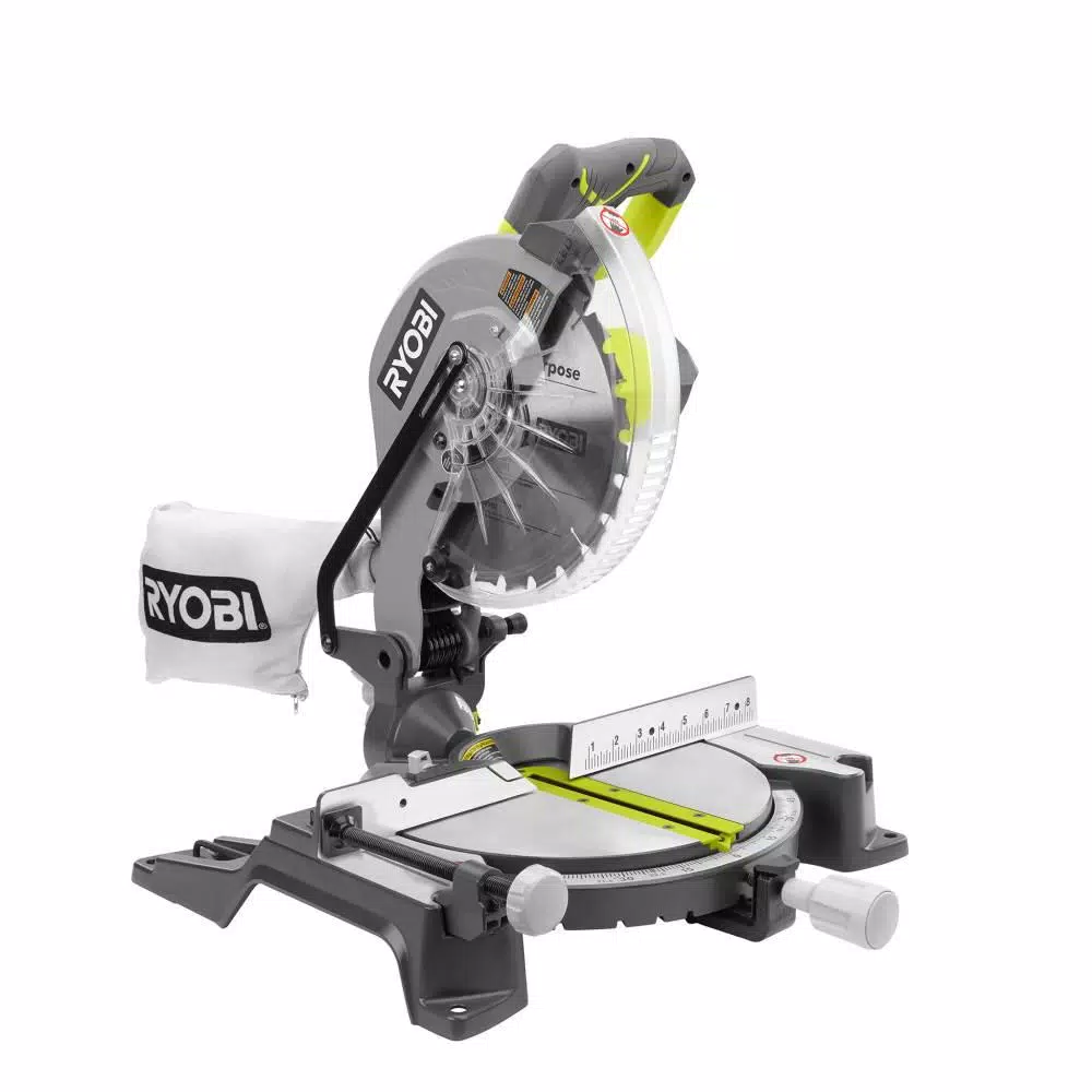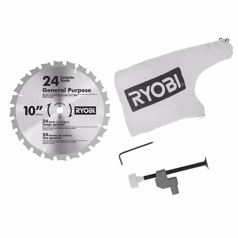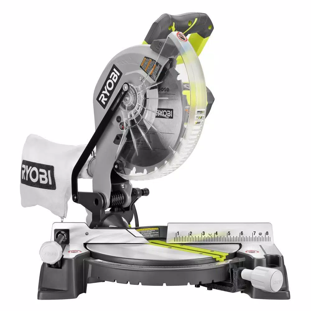 RYOBI introduces the 10 in. Compound Miter Saw with LED. The heavy duty 14 Amp motor delivers up to 5,500 RPM for the power to make difficult cuts. It features a 1-1/4 in. dust port to help keep your work area clean. The 24-tooth Carbide-Tipped blade provides improved performance for fast, clean cuts and an LED Cutline Indicator for higher accuracy. Backed by the RYOBI 3-Year Manufacturerโs Warranty, the 10 in. Compound Miter Saw with LED includes a 24-tooth Carbide Tipped Blade, a blade wrench, a dust bag, a work clamp, and an operatorโs manual.