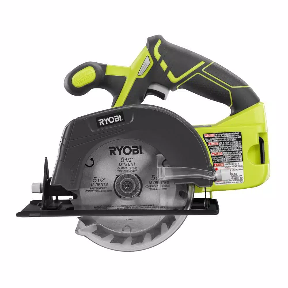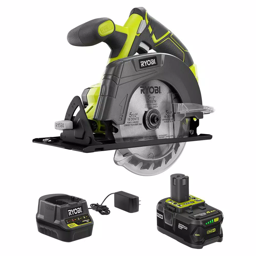 RYOBI introduces the 18-Volt ONE+ Cordless 5-1/2 in. Circular Saw with (1) 4.0 Ah Lithium-Ion Battery and 18-Volt Charger. This saw is equipped with GRIPZONE overmold for optimum grip and comfort and has a 50ยฐ bevel cut capacity. The 5-1/2 in. blade provides a 1-9/16 in. depth of cut. Best of all, it is part of the RYOBI ONE+ System of over 175 cordless tools that all work on the same battery platform. Backed by the RYOBI 3-Year Manufacturerโs Warranty, the 18-Volt ONE+ 5-1/2 in. Circular Saw includes a 4.0 Ah Battery, an 18-Volt Charger, a 5-1/2 in. blade, blade wrench and operatorโs manuals.